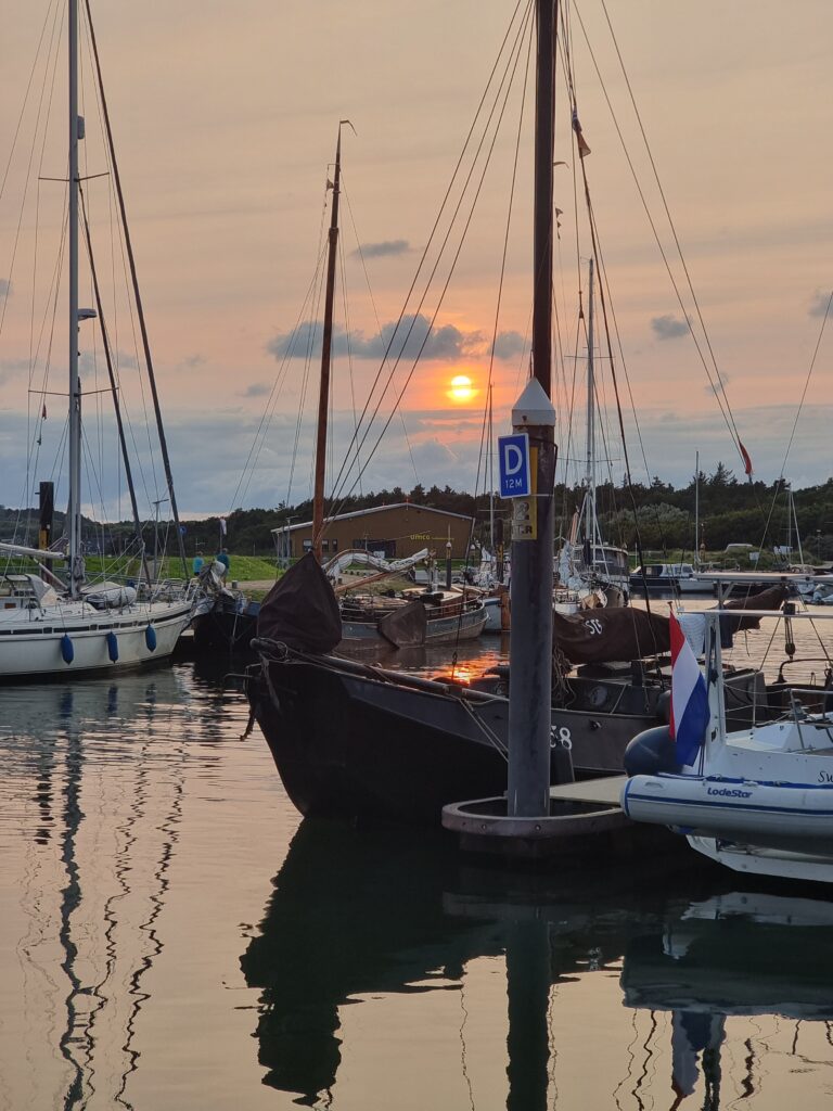 We vinden een mooi plekje in de gemeentehaven van Workum en inmiddels is de zon ook weer van de partij.