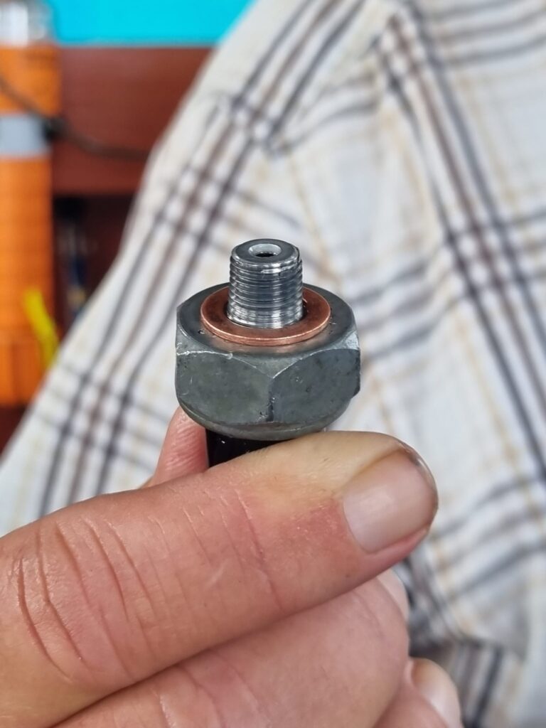 Het is inmiddels zaterdag 11:30 en waar vind je nu nog een nieuw onderdeel. Bakker in IJlst heeft hem maar sluit om 12:30. We schakelen de lokale taxi in maar die redt het niet voor 12:30. Na wat onderhandelen legt Bakker het onderdeel klaar in een bak voor de winkel en kan de taxi na zijn ritje naar Heeg de oliesensor oppikken. De duurste transportkosten ooit maar goed je moet wat. Hieronder moet de nieuwe sensor komen.