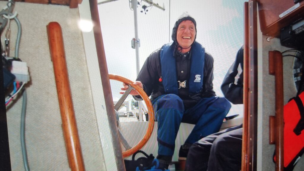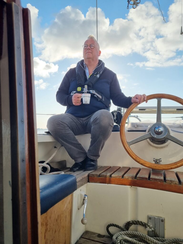 Vandaag zijn we op Vlieland gebleven. Het overlijden van Martien heeft best wat voeten in de aarde. Belletjes, foto’s dingen regelen enz. Hier nog een mooie foto van Martien achter het roer van de Regulus.