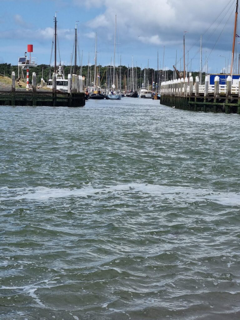 Tegen het middaguur klaart het weer op en staat er een westelijk windje van 5Bft. We besluiten richting Terschelling te zeilen. We verlaten de haven.