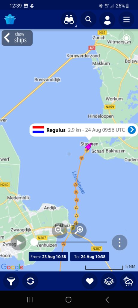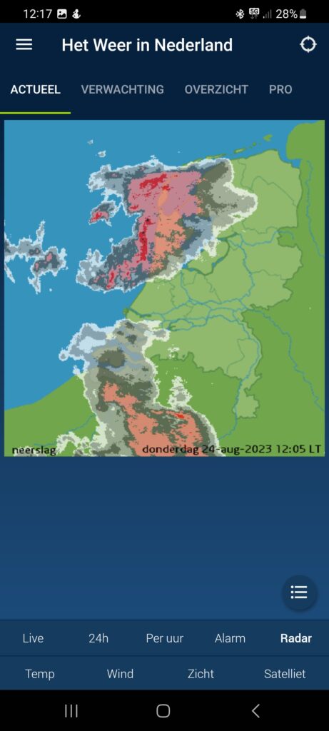 Natuurlijk houden we ook onderweg het weer in de gaten. De marifoon meldt nog geen bijzonderheden. Maar de buienradar laat ons iets anders zien.