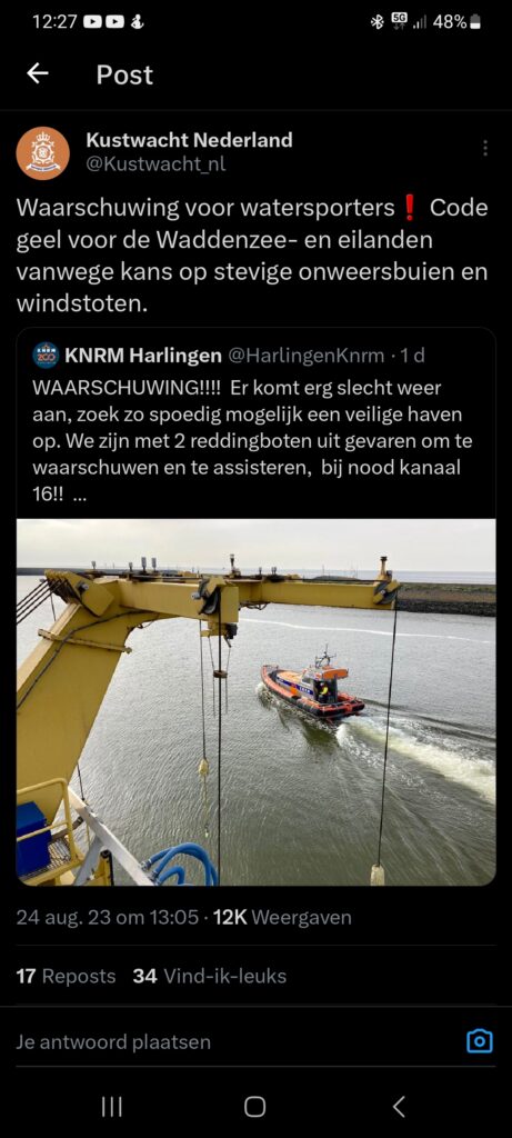 De voorspellingen voor vandaag zijn goed windkracht 3/4 en een zonnetje. Voor zuid Nederland was er wel een waarschuwing code geel maarja wij zitten toch echt in het Noorden. We vertrekken met een mooi windje en idem zonnetje