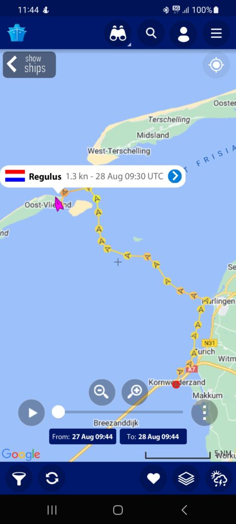 wanneer we uit de luwte van het eiland komen gaat de Regulus pas echt lopen. Halverwege de tocht krijgen we de stroom tegen en moet de Regulus hard werken. Bij Terschelling gaan we het Schuitegat in en varen tussen de drooggevallen vlaktes door.