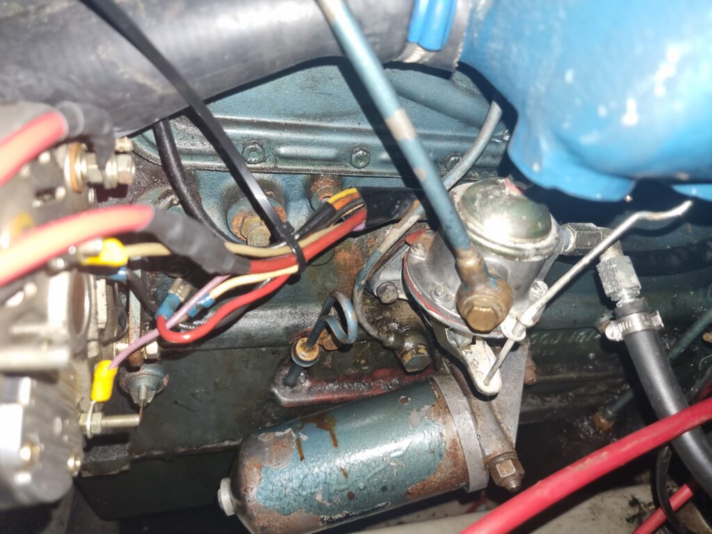 Dat is niet goed, het buisje waar je normaal de oliepeilstok in doet viel in het ruim. Oei zou er wat afgebroken zijn? Eerst het pijpje maar eens uit het ruim krijgen. Met een knijper op een veer lukte dat. Er blijkt gelukkig schroefdraad op het pijpje te zitten. Waarschijnlijk heeft het losse pijpje oliegelekt op het filter waardoor we dachten dat het oliefilter lekte. Op de foto is het pijpje en de peilstok weer in ere hersteld. Omdat het pijpje nu korter is doordat het schroefdraad weer in de motor zit. Het oliepeil staat nu op maximum!