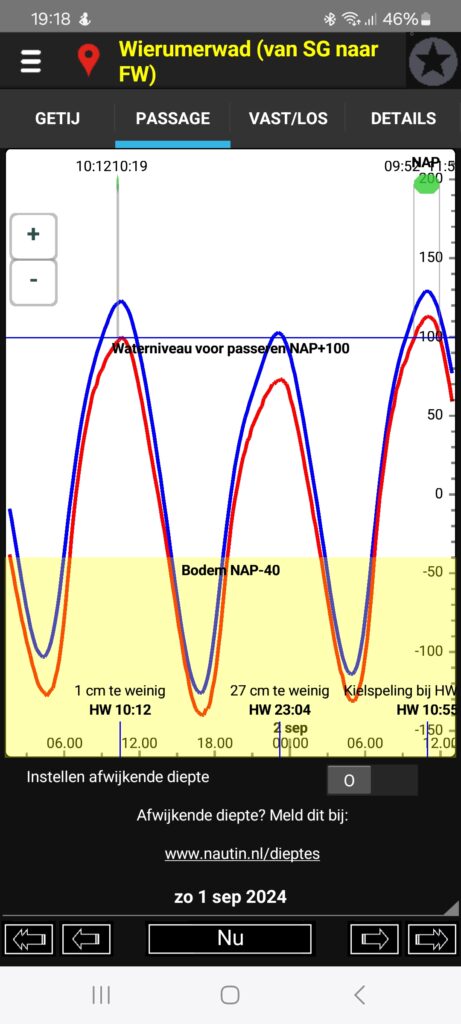 De wind is op dit moment en de komende dagen een spelbreker. Er staat een straffe oostenwind. Daardoor wordt het waterpeil lager. Het water wordt de wadden uitgeduwd. Op de grafiek hieronder zie je het effect. De Blauwe lijn geeft de normale waterhoogte aan en de rode de actuele. Onderaan zie je hoeveel water we te kort onder de kiel hebben.