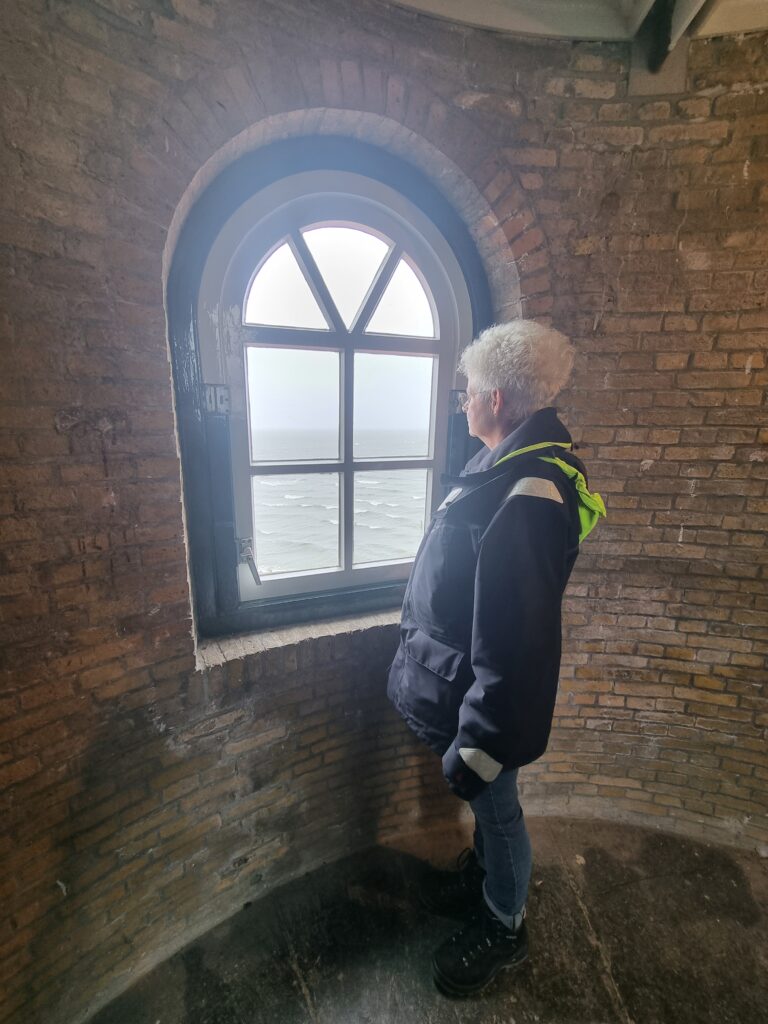 Het is nu rustig bij de vuurtoren, de stevige wind schrikt mensen af denken we. Het is leuk om even binnen te kijken. Met zicht op het dorp.