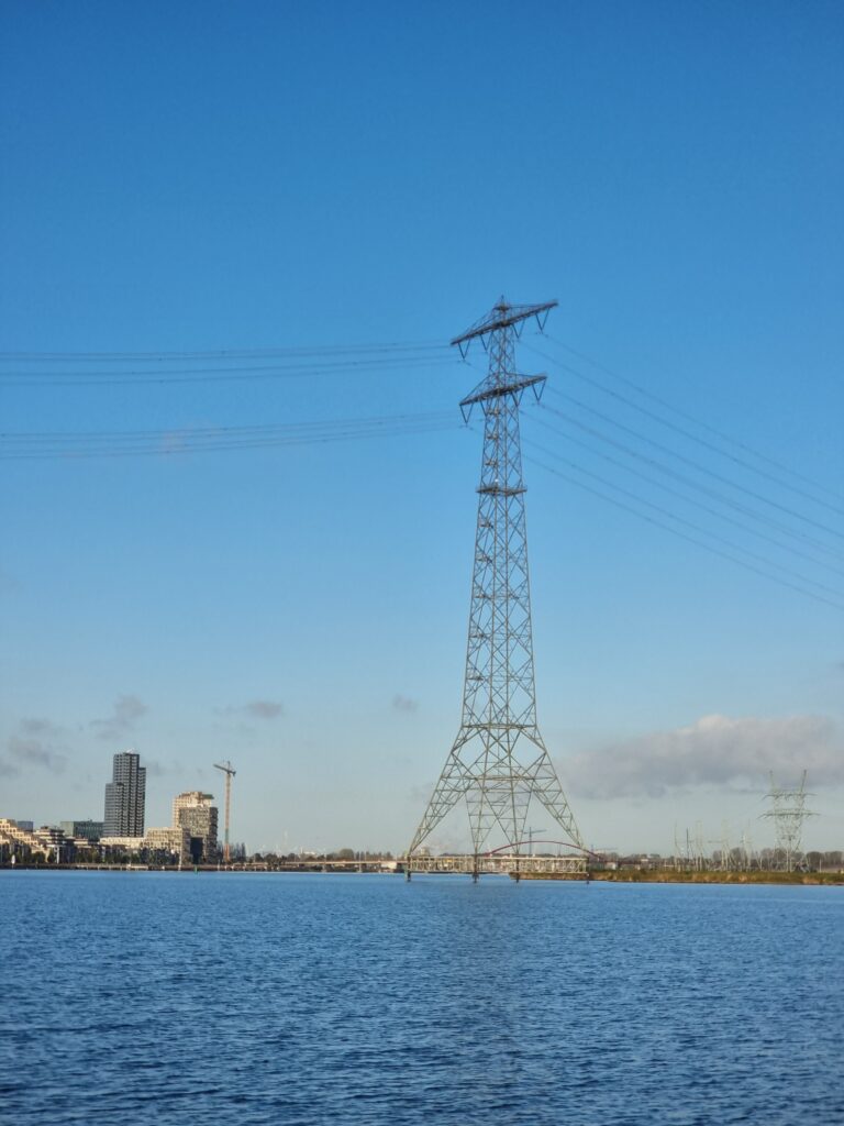 We varen onder de hoogspanning door naar Schellingwoude. We mochten door de middensluis, die hadden we nog niet eerder gehad