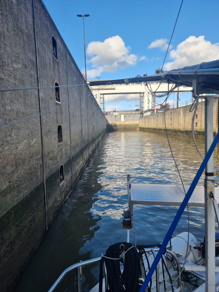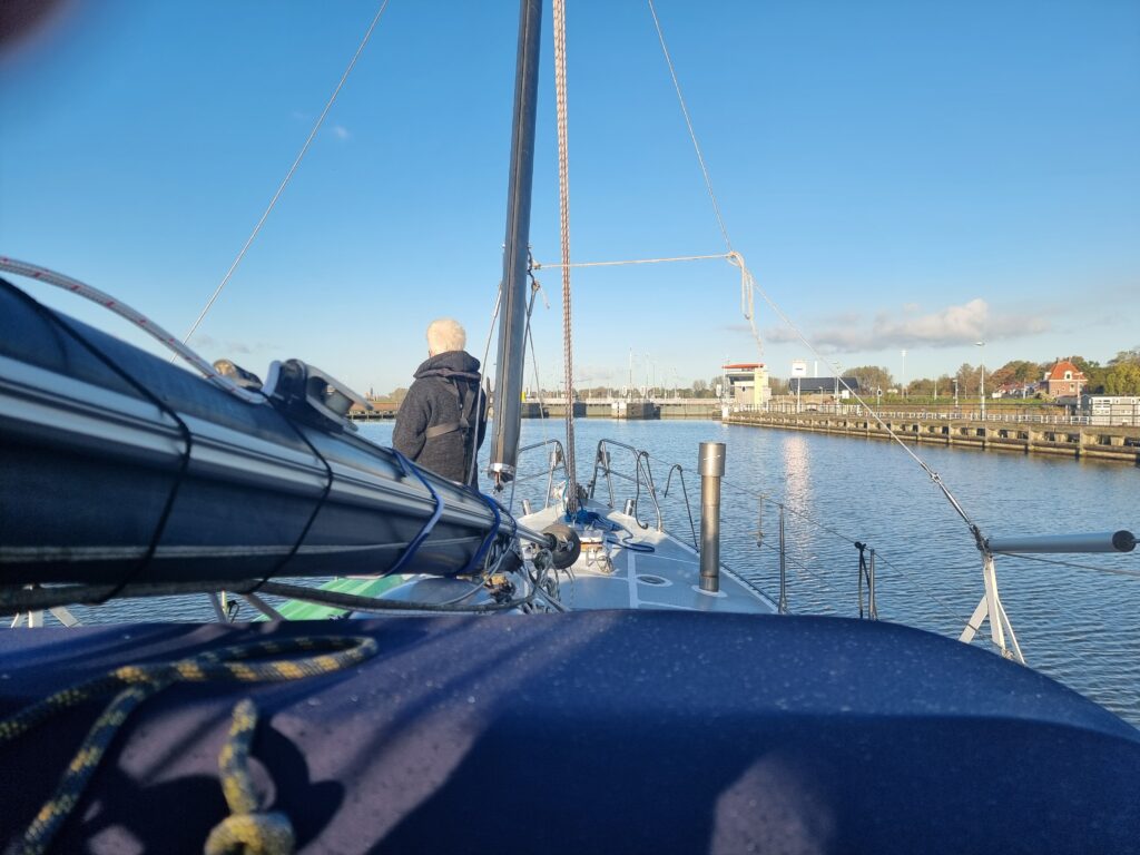 Het AmsterdamRijnkanaal is niet erg druk. In Vreeswijk schutten we in de kleine grote sluis.