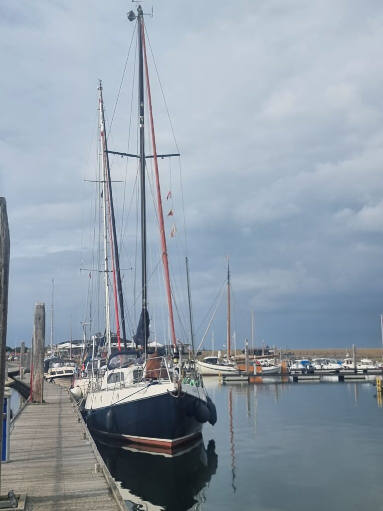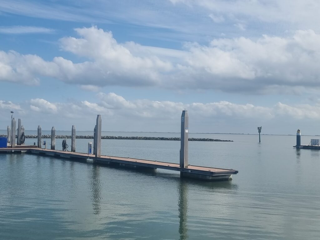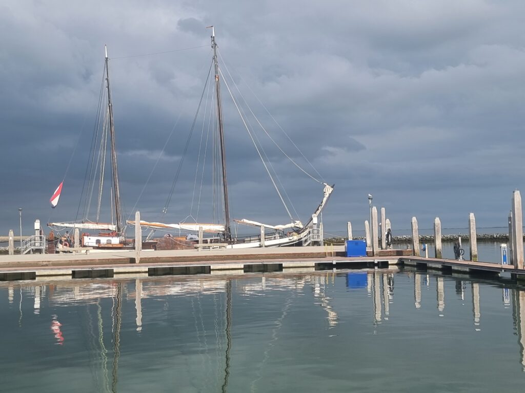 Afgelopen nacht hadden we een krachtige zuiden wind. Er liggen weliswaar 2 drijvende steigers tussen ons en de ingang, maar dat dempt de golven niet. Doordat de schepen een kwartslag gedraaid liggen tov vroeger komen de golven nu van opzij. De Regulus golft flink en ligt aan lagerwal tegen de steiger. Dus iedere twee uur even op of de stootkussen nog goed zitten en het bootje nog goed ligt. In overleg met de havenmeester verhuizen we naar de langesteiger. Voor de komende nacht liggen we een stuk beter.