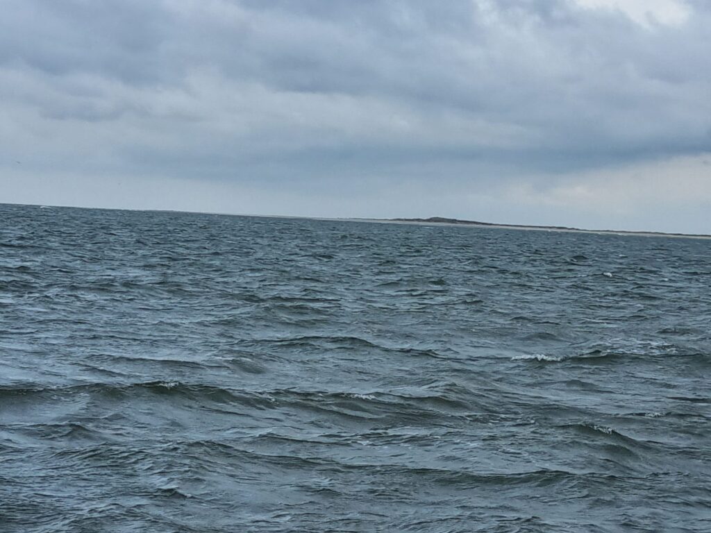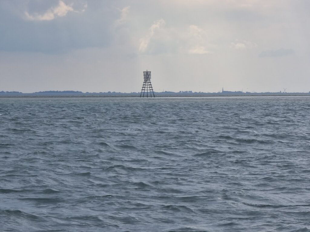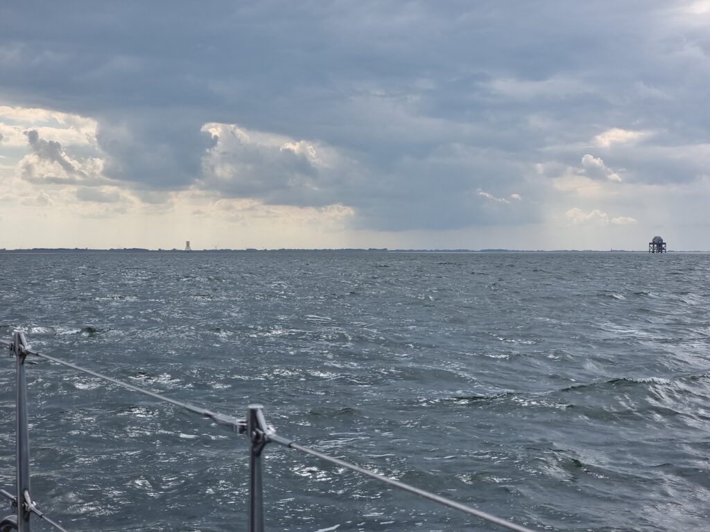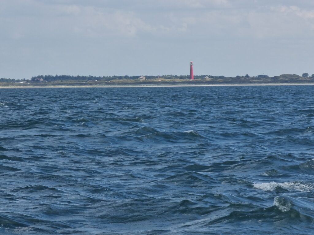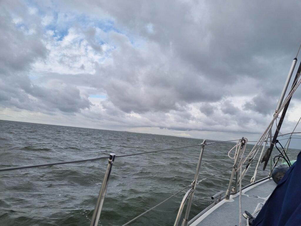 Vandaag gaan we door naar het Oosten. Over het Wad gaat qua tij en diepte niet lukken. Daarom gaan we over zee. We gaan met de ebstroom mee naar zee en willen bij Schiermonnikoog weer met de vloedstroom mee naar binnen. De reis is goed voorbereid en er wordt een wind 4/5 verwacht. Over het westen van het land zien we wel aardig wat buien. Die lijken niet verder dan Terschelling te komen. Voor de zekerheid zetten we een rif in het grootzeil. Dat blijkt in het zeegat geen overbodige luxe.