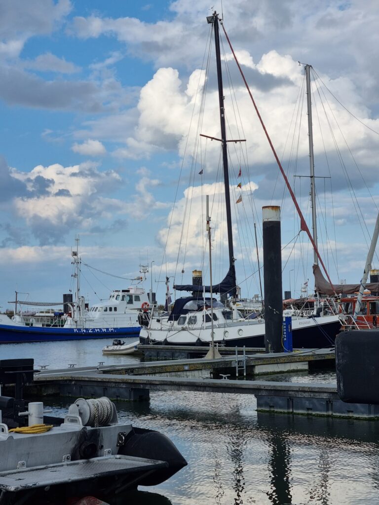 We vinden een mooi plekje in de buitenhaven van Lauwersoog vlak bij de Gebroeders Luden.