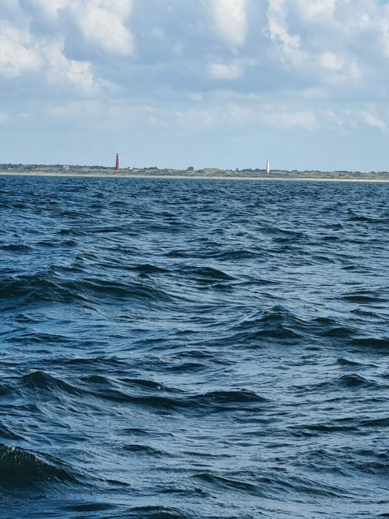 Om op de Noordzee te komen moeten we eerst om het Bornrif heen. De geul in het zeegat blijft altijd spannend. Aan beide zijden van de geul staan brekers. Er is weinig ruimte voor fouten. Net boven Terschelling krijgen we de eerste bui met wind over.