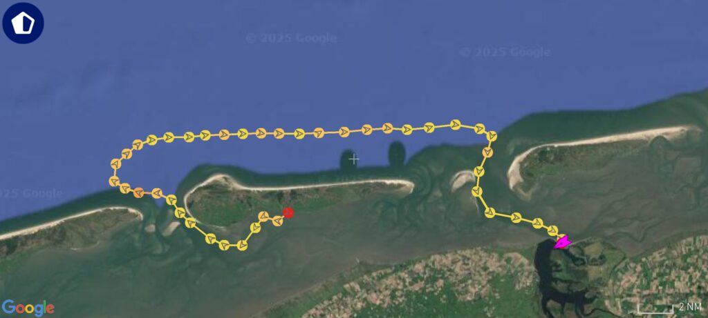 Het zeegat bij Schiermonnikoog maakt een paar rare bochten. Dus de zeilen gaan naar beneden en de motor moet het werk doen.