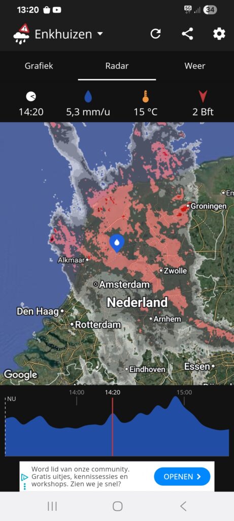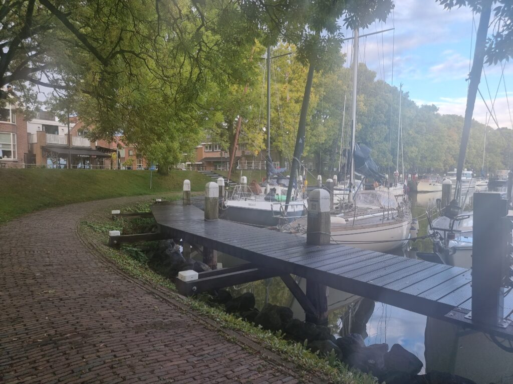 In Enkhuizen is ons favoriete plekje aan de kop van de haven nog vrij. Eind van de middag wordt het weer droog.