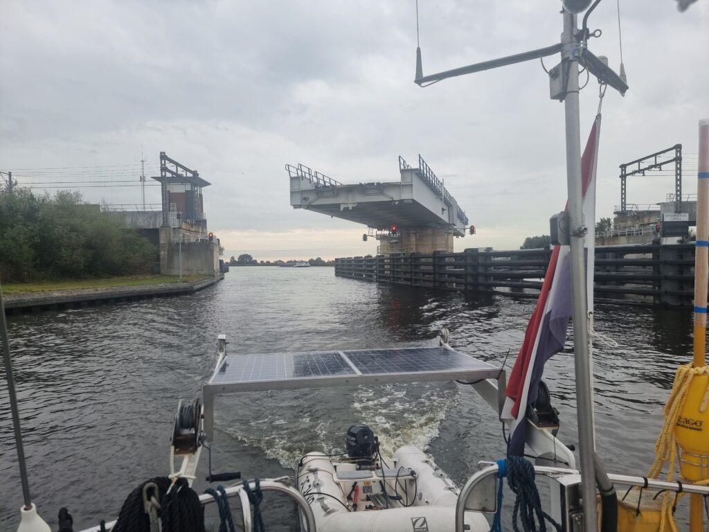 Als eerste brug komen we de spoorbrug Grou tegen. De brug gaat maar kort open, wanneer we er door zijn gaat hij direct weer dicht.