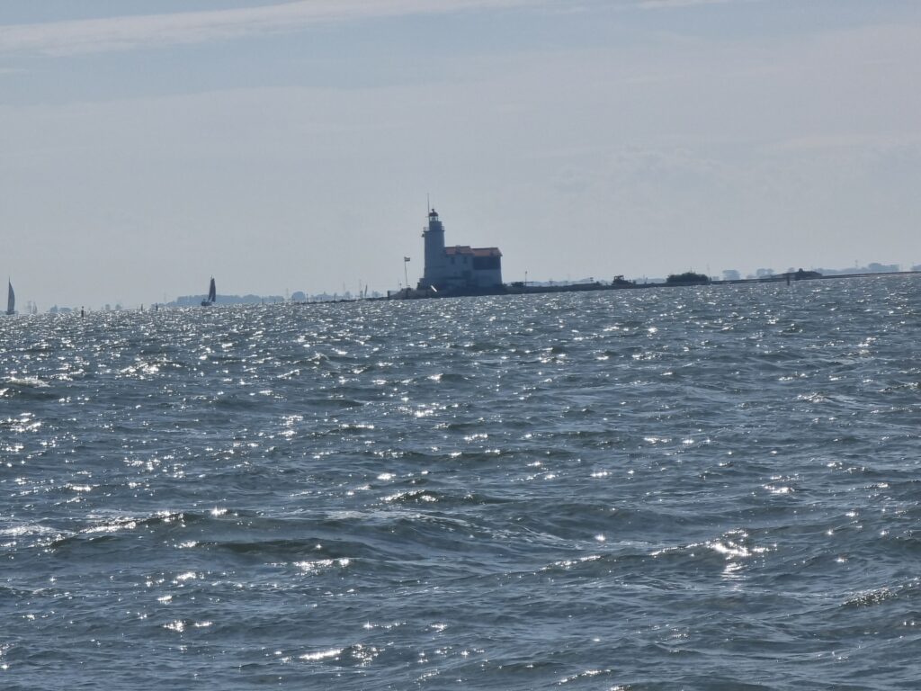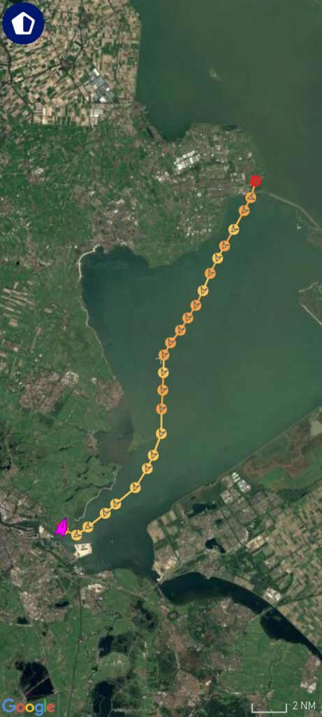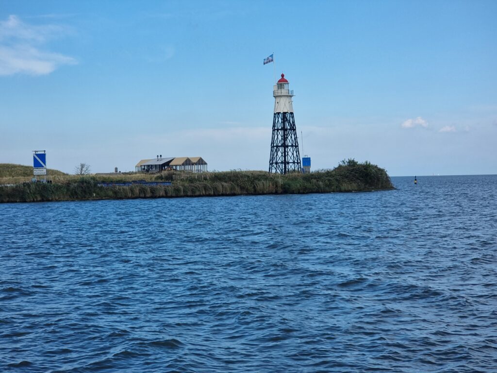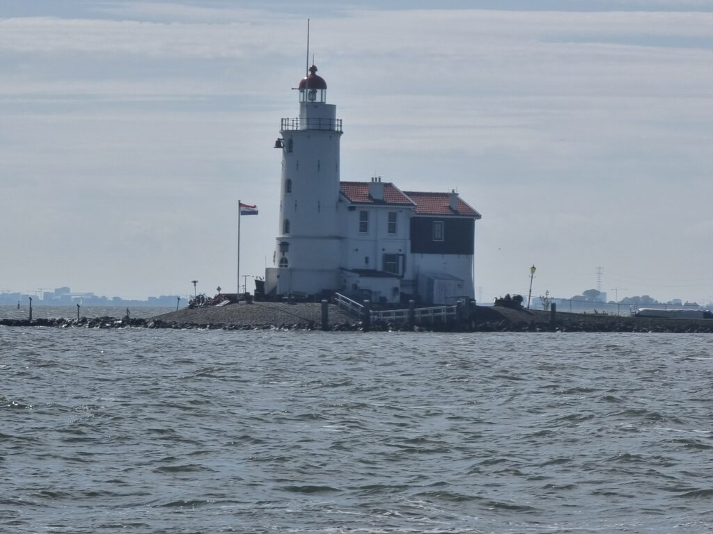 We schutten via het naviduct en op het Markermeer kijken we of het bezeild is. De wind is zuidzuidoost en dat is een lastig windje. We hijsen onze drie zeilen en varen scherp aan de wind richting het Paard van Marken. Na een paar uur zeilen halen we de zeilen naar beneden omdat we anders in Volendam terecht komen.